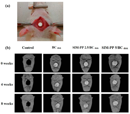 Representative calvarial bone defects of the rat model are shown in experimental photograph (a). The radiography study observed (b) calvarial bone defects of the rat model at 0, 4 and 8 weeks after implantation of 2.5 μmol of SIM and 5.0 μmol of SIM in SIM-PP/BCdisk samples (ϕ 5 mm; h 0.7 mm). Notes: calvarial bone defects only were used as controls.