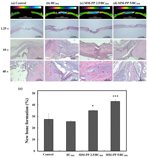 We confirmed the new bone formation in the calvarial defect by H&E staining in Figure 4a–d. The results of the histomorphological analysis revealed an ingrowth of osteoblasts in the interior of the bioceramic, and obvious bone healing and a bony bridge were observed in the SIM-PP 2.5/BCdisk group and the SIM-PP 5/BCdisk group (Figure 4c,d). The quantification of new bone formation also showed that both the SIM-PP 2.5/BCdisk group and the SIM-PP 5/BCdisk group had significantly greater new bone formation inside the bioceramics than the controls, in a dose-dependent manner (Figure 4e).