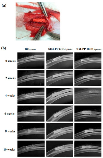 A representative radial bone defect rabbit model is shown in experimental photograph (a). The radiography study was performed to evaluate (b) the 10-mm nonunion radial bone defect rabbit model at 0, 2, 4, 6, 8 and 10 weeks after implantation of BCcylinder samples (ϕ1 3.5 mm; ϕ2 1.5 mm; h 10 mm), 5.0 μmol of SIM in SIM-PP/BCcylinder and 10.0 μmol of SIM in SIM-PP/BCcylinder.