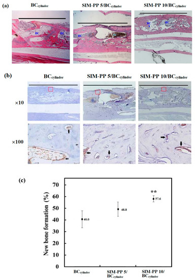 As X-ray analysis cannot distinguish between the BC and new bone formation in the defect area, we next used H&E analysis to observe and quantify the detailed bone growth in the defect area. The H&E staining results showed bridging of the defect area with ingrowth of osteoblasts invading into the bioceramic interior and significant bone-healing effects in both the SIM-PP 5/BCcylinder and SIM-PP 10/BCcylinder groups. These effects were superior in the SIM-PP 10/BCcylinder group when compared to the other two groups at 10 weeks (Figure 6a). Quantification of the H&E results showed that the SIM-PP 10/BCcylinder group had the highest new bone formation (Figure 6c). New blood vessel formation in the defect area was needed for osteogenic precursor cells to invade into the BC interior. IHC staining of the angiogenesis marker von Willebrand factor (VWF) also revealed higher VWF staining in both the SIM-PP 5/BCcylinder and SIM-PP 10/BCcylinder groups compared to the BCcylinder group at 10 weeks (Figure 6b). These results confirmed that the rabbit groups treated with bioceramics containing SIM-PP NPs exhibited repair of nonunion radial bone defects.