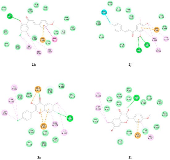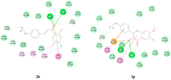 2.3.3. Docking of Chalcones (2h, 2j, 2n and 2p) and Flavonols (3b, 3c, 3l and 3p) into BACE-1