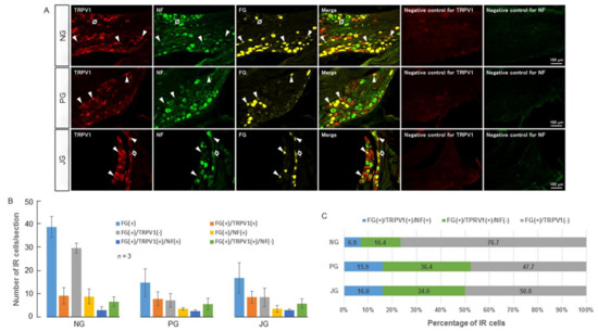 (A) Photomicrographs of TRPV1 localization in the NPJc. Black-filled arrows indicate examples of cells positive for FG, TRPV1 and NF-200. White arrowheads indicate examples of cells positive for both FG and TRPV1, but negative for NF-200. (B) Number of TRPV1-positive cells in nodose (NG), petrosal (PG), and jugular (JG) ganglia. (C) Percentage of TRPV1-positive cells in nodose (NG), petrosal (PG), and jugular (JG) ganglia. FG(+): Cells stained with FG. FG(+)/TRPV1(+): FG-stained cells immune-positive for TRPV1. FG(+)/TRPV1(−): FG-stained cells immune-negative for TRPV1. FG(+)/NF(+): FG-stained cells immune-positive for NF-200. FG(+)/TRPV1(+)/NF(+): FG-stained cells immune-positive for TRPV1 and NF-200. FG(+)/TRPV1(+)/NF(−): FG-stained cells immune-positive for TRPV1 but not NF-200. NPJc: nodose-petrosal-jugular ganglionic complex. FG: fluoro-gold. NF-200: neurofilament-200. IR: immunoreactive. Scale bars represent 100 μm.