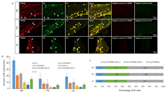 (A) Photomicrographs of TRPM8 localization in the NPJc. Black-filled arrows indicate examples of cells positive for FG, TRPM8, and NF-200. White arrowheads indicate examples of cells positive for both FG and TRPM8, but negative for NF-200. (B) Number of TRPM8-positive cells in nodose (NG), petrosal (PG), and jugular (JG) ganglia. (C) Percentage of TRPM8-positive cells in nodose (NG), petrosal (PG), and jugular (JG) ganglia. FG(+): Cells stained with FG. FG(+)/TRPM8(+): FG-stained cells immuno-positive for TRPM8. FG(+)/TRPM8 (−): FG-stained cells immuno-negative for TRPM8. FG(+)/NF(+): FG-stained cells immuno-positive for NF-200. FG(+)/TRPM8(+)/NF(+): FG-stained cells immuno-positive for TRPM8 and NF-200. FG(+)/TRPM8(+)/NF(−): FG-stained cells immuno-positive for TRPM8 but not NF-200. NPJc: nodose-petrosal-jugular ganglionic complex. FG: fluoro-gold. NF-200: neurofilament-200. IR: immunoreactive. Scale bars represent 100 μm.