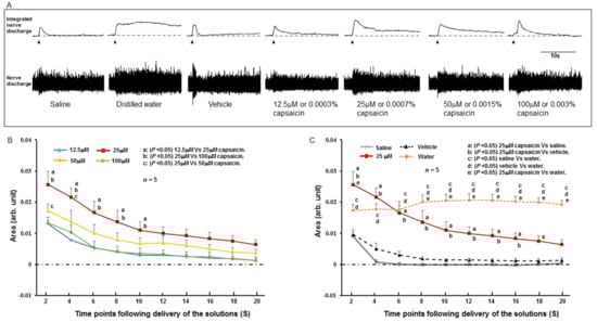 (A) The response of the superior laryngeal nerve (SLN) to capsaicin and other stimulating solutions. Arrowheads indicate onset of delivery of the stimulating solutions. (B) SLN responses to different concentrations of capsaicin. (C) Comparison of SLN responses to capsaicin, saline, vehicle, and distilled water. The y-axis shows the area of the integrated SLN response calculated for every 2 s from the onset of infusion of stimulating solutions. Arb. Unit: arbitrary unit. S: seconds.
