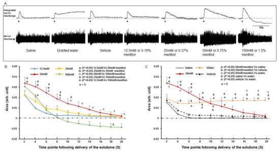 (A) The response of the superior laryngeal nerve (SLN) to menthol and other stimulating solutions. Arrowheads indicate onset of delivery of the stimulating solutions. (B) SLN responses to different concentrations of menthol. (C) Comparison of SLN responses to menthol, saline, vehicle, and distilled water. The y-axis shows the area of the integrated SLN response calculated for every 2 s from the onset of infusion of stimulating solutions. Arb. Unit: arbitrary unit. S: seconds.