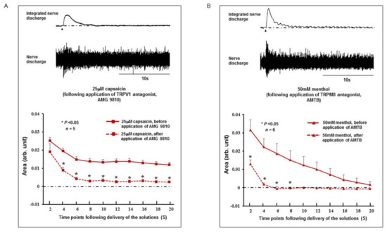 Effect of prior application of TRPV1 and TRPM8 antagonists (AMG 9810 and AMTB as TRPV1 and TRPM8 antagonists, respectively) on respective agonist-evoked superior laryngeal nerve (SLN) responses. (A) SLN response following application of TRPV1 antagonist. (B) SLN response following application of TRPM8 antagonist. The y-axis shows the area of the integrated SLN response calculated for every 2 s from the onset of infusion of stimulating solutions. Arb. Unit: arbitrary unit. S: seconds.