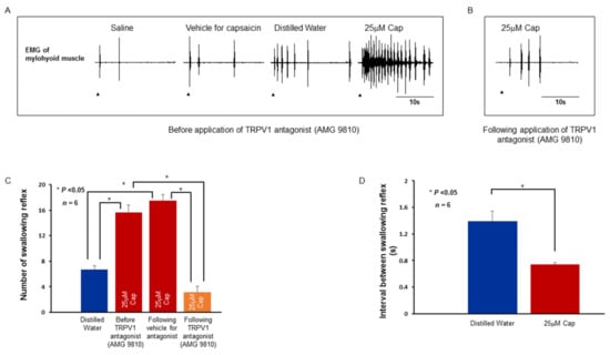 AMG 9810 (2E)-N-(2,3-Dihydro-1,4-benzodioxin-6-yl)-3-[4-(1,1-dimethylethyl)phenyl]-2-propenamide (Enzo Life Sciences, Inc. NY, USA) and AMTB [N-(3-aminopropyl)-2-{[(3-methylphenyl) methyl]oxy}-N-(2-thienylmethyl)benzamide hydrochloride salt] (Wako Pure Chemical Industries Ltd. Osaka, Japan) were used as TRPV1 and TRPM8 antagonists, respectively. Various in vitro and in vivo studies showed the effeicacy of AMG 9810 and AMTB to block TRPV1 and TRPM8, respectively [71,72,73,74,75,76]. AMG 9810 was dissolved in small amount of DMSO and Tween 80 and diluted in normal saline. Solution containing DMSO, Tween 80, and normal saline was used as vehicle for AMG 9810. AMTB was dissolved in normal saline. Different concentrations of AMG 9810 and AMTB were used to determine the lowest effective concentrations at which they could inhibit and attenuate the nerve response or the number of swallowing reflexes evoked by menthol or capsaicin. The concentration that attenuated the agonist-evoked nerve response or the number of swallowing reflexes to half or less than half, was used as an effective lowest concentration. The effective lowest concentration for AMG 9810 was 125–250 μM. The effective lowest concentration for AMTB was 62.5 μM.