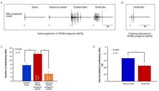 (A) Swallowing reflexes evoked by application of menthol and other stimulating solutions. Arrowheads indicate onset of delivery of the stimulating solutions. (B) Swallowing reflexes evoked by menthol following application of TRPM8 antagonist. (C) Comparison of the number of swallowing reflexes evoked by distilled water and menthol. (D) Comparison of the interval between swallowing reflexes evoked by distilled water and menthol. Men: Menthol.