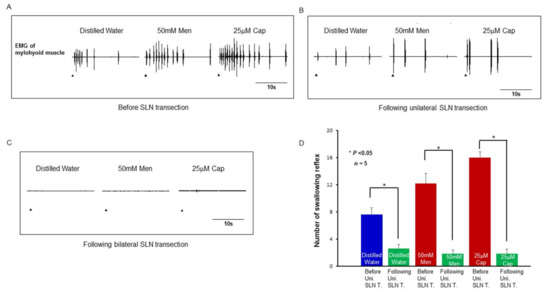 Swallowing reflexes evoked by application of distilled water, capsaicin, and menthol before SLN transection (A), following unilateral (B) and following bilateral SLN transection (C). Arrowheads indicate onset of delivery of the stimulating solutions. (D) Comparison of the number of swallowing reflexes before and after unilateral SLN transection evoked by distilled water, menthol, and capsaicin. Men: Menthol, Cap: Capsaicin, Uni. SLN T.: Unilateral transection of the superior laryngeal nerve.