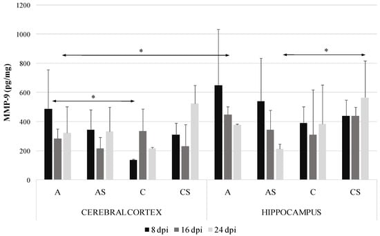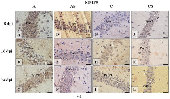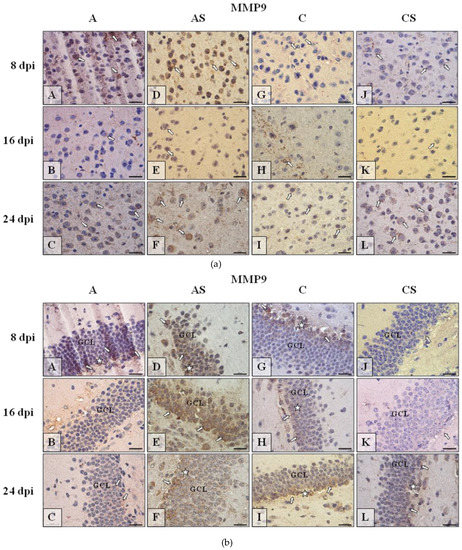 2.2. MMP-9 in the Cerebral Cortex and Hippocampus during Acanthamoebiasis