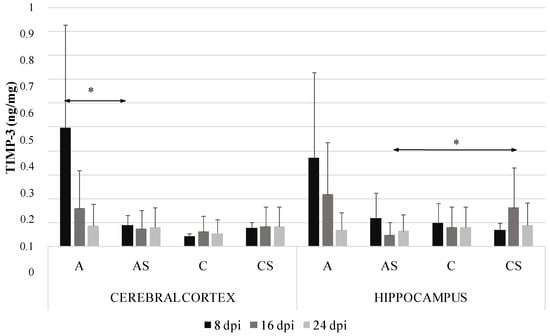 2.5. MMP-9/TIMP-1 and MMP-2/TIMP-3 Ratios in the Brain Structures