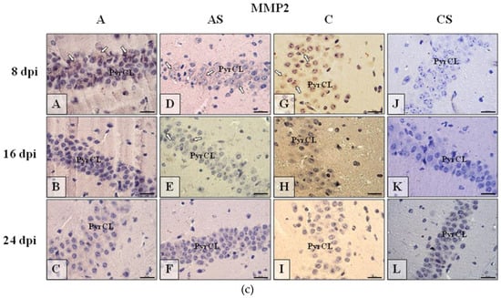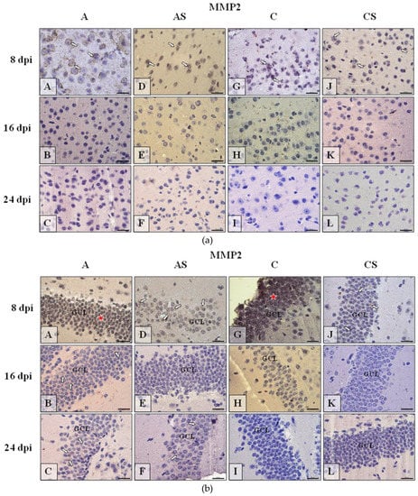 2.1. MMP-2 in the Cerebral Cortex and Hippocampus during Acanthamoebiasis
