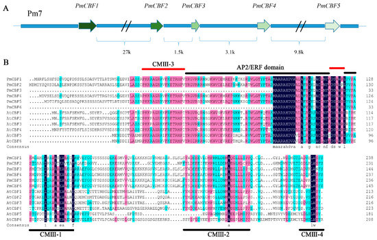 CBF genes in P. mume. (A) Gene locations of PmCBFs on chromosome 7; (B) Multiple sequences alignment of CBF proteins from P. mume and other species. Multiple sequence alignment of the CBF genes was applied using DNAMAN 7.0 program (Lynnon Corp., Quebec, QC, Canada). The AP2/ERF domain and CMIII domain (CMIII-1, CMIII-2, and CMIII-4) were shown by lines on bottom of the alignment. CMIII-3 was indicated by the red lines. The protein sequences of these CBF genes were shown in Supplementary Data S3.