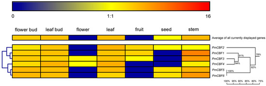 To measure the roles of PmCBFs in different organs (flower bud, leaf bud, flower, leaf, fruit, seed, and stem), the expression patterns were observed using the real-time quantitative PCR (RT-qPCR) and displayed by a heat map (Figure 3). Six PmCBFs were expressed in seven organs. These genes were highly detected in stem, moderately expressed in flower bud, leaf bud, and leaf, and poorly expressed in flower, fruit, and seed. According to the hierarchical clustering performed by Genesis software, PmCBFs were divided into two groups. PmCBF5 and PmCBF6 were gathered in one group. These two genes were predominantly detected in flower bud, leaf bud, leaf, and stem; and were slightly expressed in flower, fruit, and seed. The other group contained PmCBF1, PmCBF2, PmCBF3, and PmCBF4. The expression levels of these four genes were notable in flower bud, leaf bud, leaf, and stem. However, there were bare expressions for PmCBF4–6 in fruit, PmCBF1–2 and 5–6 in flower, PmCBF1 and 3–4 in seed.