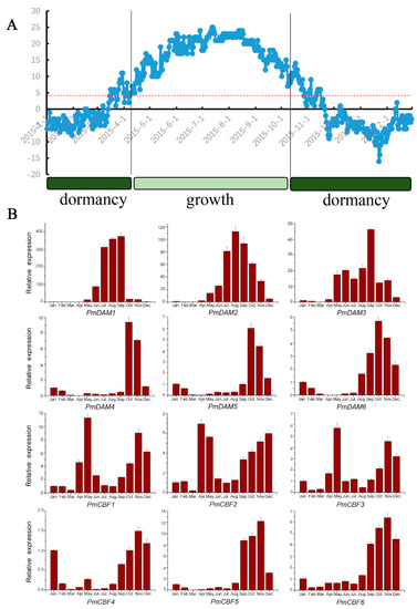 (A) The lowest day temperatures and growth statuses of Prunus mume stems; (B) Corresponding expression patterns of PmCBFs and PmDAMs during different periods of stem development. All RT-qPCR experiments were employed with three biological duplications, and each duplication was repeated in triplicate. The standard deviation of the results was shown by the error bars.