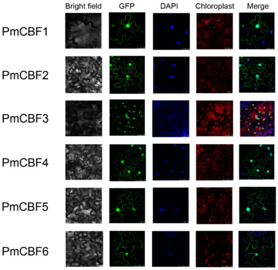 Controlled by a 35S promoter, the PmCBF with GFP was expressed in N. benthamiana leaves. All the PmCBFs were co-located alongside 4′,6-diamidino-2-phenylindole dihydrochloride (DAPI) in the parenchyma cells of leaves’ abaxial epidermis in N. benthamiana, suggesting that PmCBFs are primarily localized to the cell nucleus (Figure 6). PmCBF3 was also detected in chloroplasts.