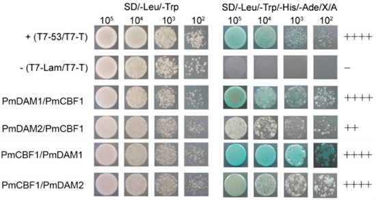 Yeast two-hybrid assays were performed to determine protein complexes formed by PmCBFs and PmDAMs. PmCBF2, PmCBF3, PmCBF4, PmCBF5, and PmCBF6 had auto activation activity and cannot be used as baits. PmCBF1 and all PmDAMs were reconstructed in bait vectors. None of the experimental proteins had toxicity. Consequently, only the interaction profiles of PmCBF1 and six PmDAMs could be obtained by yeast two-hybrid assay.