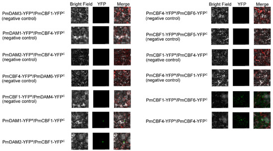 The protein-protein interactions between PmCBFs and PmDAMs were further verified through BiFC. The reactions (i.e., PmCBF1 and PmDAM1, PmCBF1 and PmDAM2) showed the YFP fluorescence in the nucleus, indicating that PmCBF1 could form dimers with PmDAM1, PmDAM2. The localization of YFP fluorescence in the nucleus revealed the significant interactive trend among PmCBFs. For PmCBFs, PmCBF4 could form a homodimer, and PmCBF1 could dimerize with PmCBF6 (Figure 8).