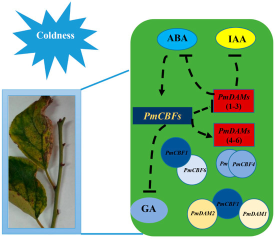 The correlation matrix displayed the whole interaction among genes and hormones (Figure 5B). PmCBF1–3 displayed an obvious negative correlation with PmDAM1–3 and PmCBF4–6 showed a significant positive correlation with PmDAM4–6. IAA negatively correlated with PmDAM1–3. In contrast, the other genes seem not to relate with IAA. GA3 was negatively controlled by two types of genes, especially PmCBFs. PmCBF1–3 were positively correlated with the expression of ABA, and PmDAM1–6 performed antipodally with ABA. The relative low values in correlation might infer the indirect regulation model for PmCBFs and PmDAMs.