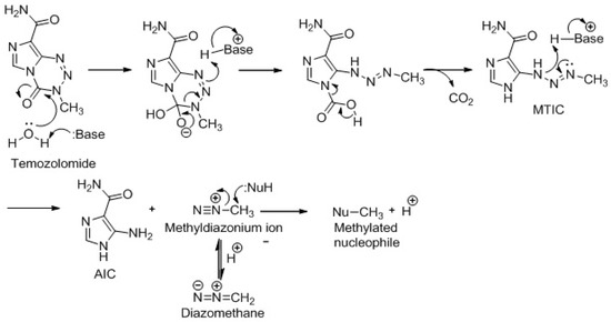 TMZ is not affected by the acid pH of the stomach and is rapidly absorbed by the gastro-intestinal tract. However, in the blood and other tissues, it is first hydrolyzed to 5-(3-dimethyl-1-triazenyl) imidazole-4-carboxamide (MTIC), which is then quickly converted into its reactive form, the methyl-diazonium ion [2]. The methyldiazonium ion formed by the breakdown of MTIC primarily methylates guanine residues in the DNA molecule, resulting in the formation of O6- and N7-methylguanines (Figure 1). Initially, it was speculated that the first step of this activation process could be promoted by the specific local microenvironment conditions found in the major loop of the DNA helix. However, this hypothesis was difficult to be confirmed, and now it is believed that TMZ turns into MTIC even in in the absence of DNA [3,4,5]. Furthermore, the similarity between the half-life of TMZ in phosphate buffer pH 7.4 and in plasma from patients undergoing i.v. or oral administration indicates that the transformation TMZ → MTIC is a spontaneous and pH-dependent reaction, which occurs without the involvement of any catalysis by enzymes or other macromolecules [6]. The absence of any hepatic involvement in the activation process of TMZ may contribute to its high reproducibility pharmacokinetics, regardless of interpersonal variations in hepatic conversion rate [7].