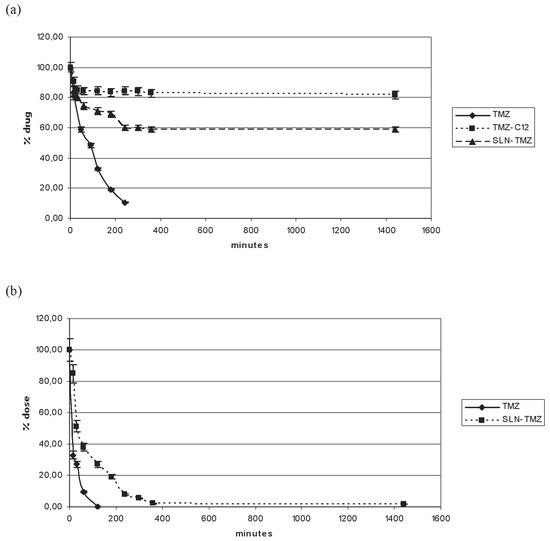 The stability of TMZ and its prodrug loaded in SLN was investigated both in Roswell Park Memorial Institute 1640 medium (RPMI 1640) and in plasma (Figure 4). Both media caused drug degradation, even if this phenomenon was quicker in plasma. In RPMI 1640 the lipophilic prodrug (TMZ-C12) was cleaved more slowly than the parent drug (TMZ), probably because of the influence of its low solubility, and the loading in SLN increased its stability. In the plasma the pure prodrug stability was not investigated because of its low solubility, but important differences were detected between free TMZ and SLN-TMZ, which resulted more stable.