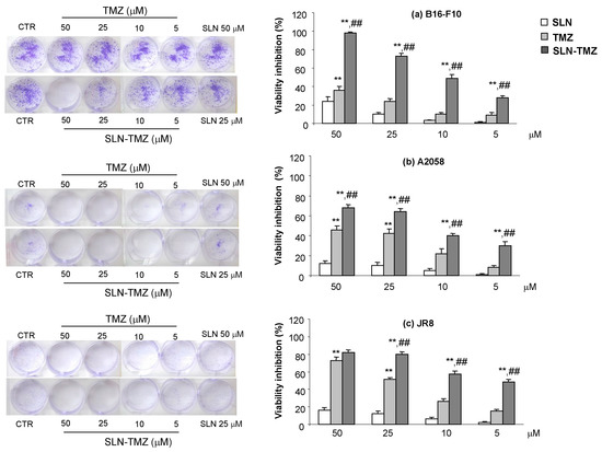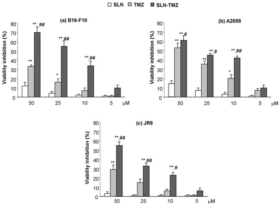 Cytotoxicity on melanoma cells: (a) B16-F10; (b) A2058; (c) JR8. Cells were treated with free TMZ and SLN-TMZ at 50–5 μM concentration for 72 h. Then, the cell proliferation reagent WST-1 is used for 2 h. Cells that had received no drug, as control, were normalized to 100%, and the readings from treated cells were expressed as % of viability inhibition. Eight replicates were used to determine each data point and five different experiments were performed. Data are shown as mean ± SEM. Statistical analyses were performed using one-way ANOVA and the Dunnett test. ** p < 0.01 compared to the PBS-treated group. * p < 0.05 compared to the PBS-treated group. ## p < 0.01 compared to the TMZ-treated group. # p < 0.05 compared to the TMZ-treated group.