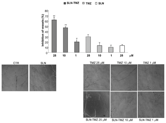 HUVEC were isolated from human umbilical veins by trypsin treatment (1%) and cultured in M199 medium with the addition of 20% FCS, 100 U/mL penicillin, 100 μg/mL streptomycin, 5 UI/mL heparin, 12 μg/mL bovine brain extract, and 200 mM glutamine. The HUVEC were grown to confluence in flasks and used at the 2nd–5th passages. The use of HUVEC was approved by the Ethics Committee of the “Presidio Ospedaliero Martini” of Turin and conducted in accordance with the Declaration of Helsinki. Written informed consent was obtained from all donors. HUVEC were seeded in 96-well plates and treated at 37 °C, 5% CO2, for 24 h with different concentrations of the studied drugs. The cell proliferation reagent WST-1 was used. Drug concentrations that were not cytotoxic were used for the tubule-formation assay. Then, HUVEC were seeded onto 48-well plates (5 × 104/well) previously coated with 75 μL of growth factor-reduced Matrigel, in the absence or presence of free TMZ and SLN-TMZ (1–25 μg/mL), or empty SLN at the concentration corresponding to that used with entrapped drugs. The morphology of the capillary-like structures formed by the HUVECs was analyzed by an inverted microscope after 15 h of culture, and photographed with a digital camera. Tube formation was analyzed with an imaging system (Image Pro Plus Software for microimaging, Media Cybernetics, version 5.0, Bethesda, MD, USA). Tubule-formatio was evaluated by counting the total number of tubes in three wells and five different experiments were performed, as previously described [18]. Cells that had received no drug, as control, were normalized to 100% of new formed vessels and the readings from treated cells were expressed as % of vessel inhibition.