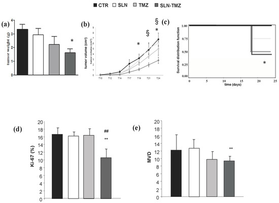 In vivo experiments on mouse melanoma model. C57BL6/J mice were injected subcutaneously with B16-F10 cells (1 × 105 in 100 μL/mouse). Ten days after the tumor injection, mice were treated three times a week for two weeks by i.v. injection of free TMZ, SLN-TMZ or empty SLN (100 μL each–0.5 μM/g) or the same volume of PBS as control. Mice were sacrificed at the end of the experiment. Then, tumors, organs and blood were collected and kept for histological analysis. Graphs show: (a) tumor weight (grams—mean ± SEM), (b) tumor volume curves (cm3—mean ± SEM), (c) survival distribution function, (d) % of Ki-67-positive cells among tumor cells (e) MVD determined by counting the individual CD31+ microvessels. Ten randomly selected areas from three tumors from each group were analyzed; data are expressed as media and interquartile ranges. Statistical analyses were performed using one-way ANOVA and the Dunnett test. * p < 0.05; ** p < 0.01 compared to the PBS-treated group. § p < 0.05 compared to the empty SLN group. ## p < 0.001 compared to the TMZ-treated group.