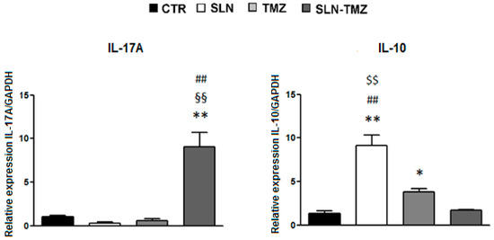To assess the effect of the therapies on the anti-tumor-immune response, we assessed expression of IFN-γ and IL-17A marking pro-inflammatory T helper type 1 (TH1) and T helper type 17 (TH17) cells, respectively, and IL-10 marking anti-inflammatory regulatory T cells (Treg) in the tumor mass by real time PCR (Figure 9). Results showed that treatment with SLN-TMZ strikingly increased expression of IL-17A (9.06 ± 1.62) compared to mice treated with PBS (1.04 ± 0.11, p < 0.01), or empty SLN (0.29 ± 0.12, p < 0.01), or free TMZ (0.59 ± 0.23, p < 0.01). By contrast, expression of IL-10 was increased in mice treated with empty SLN (9.14 ± 1.16) compared to mice treated with PBS (1.30 ± 0.35, p < 0.01) or free TMZ (3.79 ± 0.35, p < 0.01) or SLN-TMZ (1.70 ± 0.08, p < 0.01), and in mice treated with free TMZ compared to mice treated with PBS (p < 0.05). By contrast, expression of IFN-γ was nor substantially modulated by any treatment.