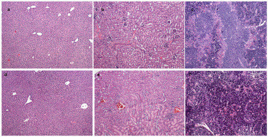 After euthanasia, all animals underwent complete necropsy. Lung, liver, kidney and spleen were collected and stored in 10% neutral buffered formalin for histological evaluation. Samples were trimmed into cassettes, paraffinized, sectioned (5 μm thick), stained with haematoxylin and eosin, and evaluated by light microscopy.