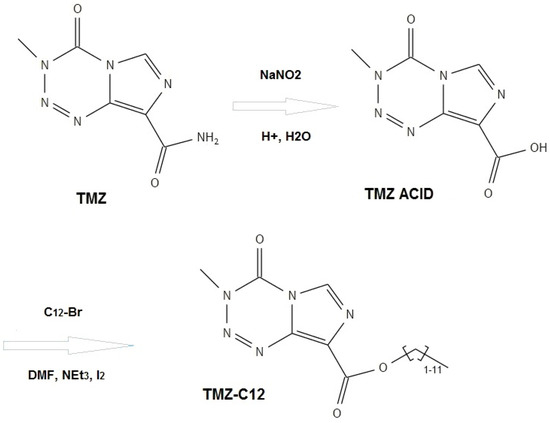 For drug loaded SLN, TMZ-C12 was dissolved in a small amount of DMF, and this solution was added to the blank SLN, led to their melting point; the drug was allowed to partition in the melted lipid for 5 min under stirring and then cooled to room temperature.