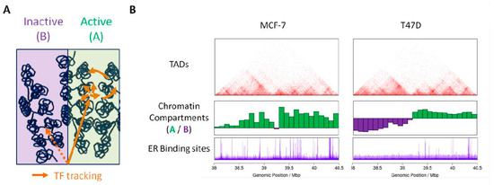 More generally, the precise mechanisms by which transcription factors find their DNA targets within the nuclear environment remains mainly unknown [62]. In addition to epigenetic modifications of DNA and nucleosomes, the way the chromatin is spatially organized in the nucleus can interfere with, either promote or limit, the accessibility of chromatin to nucleoplasmique factors. Several models of transcription factor search strategies have been proposed, which notably include facilitated diffusion through chromatin. In this model, transcription factors binding to specific chromatin sites occurs through a combination of diffusion, linear tracking and jumps, or hopping, along the chromatin fiber [63]. The fact that the genome folds readily in a non-random manner may favor such hopping from regions far away on the linear genome and may direct transcription factors to specific sites (Figure 2A). In addition, pre-existing chromatin loops can favor the residence time of transcription factors and lead to the nucleation of transcription factors enriched environments [64]. Finally, active and inactive (A/B) chromatin compartments are characterized by epigenetic signatures associated with open or compact chromatin, respectively. Transcription factors may therefore preferentially access (and bind to) the accessible active chromatin compartment (Figure 2A). The fact that domains belonging to the same compartment are found preferentially together within the nuclear space can delimit the space that transcription factors have to visit prior to reach functional sites. In this context, the cell specific compartmentalization of chromatin can contribute to the establishment of a cell specific landscape for binding of transcription factors. In line with this hypothesis, differential binding of the ER in the breast cancer cells MCF-7 and T47D is observed in genomic domains that belong to distinct chromatin compartments (Figure 2B).