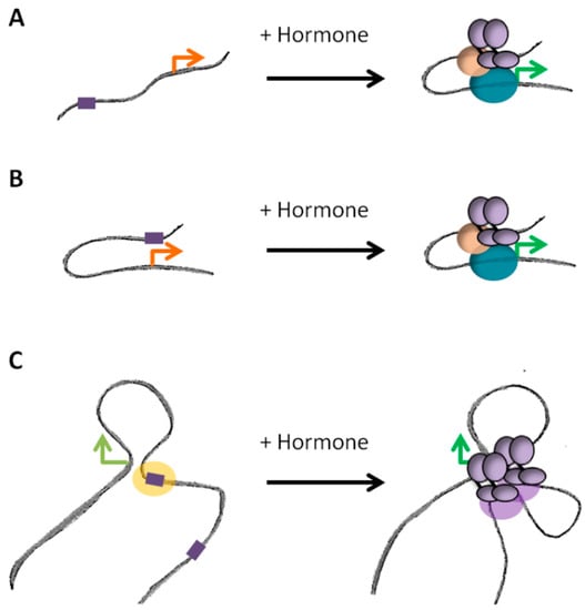 Figure 4. Different dynamics of promoter-enhancer looping. (A) Binding of the receptors upon exposure to the hormone induces the formation of loop between promoter and enhancer in an active process. (B) In other cases, the loop is established prior binding of the receptors, which activate the enhancer region in an already favorable conformation. (C) A promoter could be regulated by several enhancers, which require or not de novo chromatin looping. Binding of steroid receptors in the absence of hormones (unliganded receptors) might serve in maintaining such structures prior exposure to the hormone. Orange and green arrows correspond to paused or activated promoters, respectively.