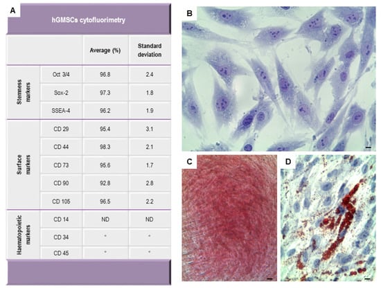 Human gingival mesenchymal stem cells (hGMSCs) characterization. (A) flow cytometry showed the positivity expression of Oct3/4, Sox-2, SSEA-4, CD29, CD44, CD73, CD90 and CD105. While haematopoietic markers are not detectable; (B) light inverted microscopy image of plastic-adherent hGMSCs stained with toluidine blue solution; (C) hGMSCs under osteogenic differentiation conditions stained with alizarin red S solution; (D) hGMSCs stained with Adipo Oil red to demonstrate adipogenic differentiation. Scale bars represent 10 μm.