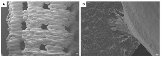 Scanning electron microscope (SEM) detection. (A) three-dimensional scaffold design observed at low magnification (50×). The scale bar represents 100 μm; (B) at high magnification (1000×), the cellular bridge is clearly visible. The scale bar represents 10 μm.