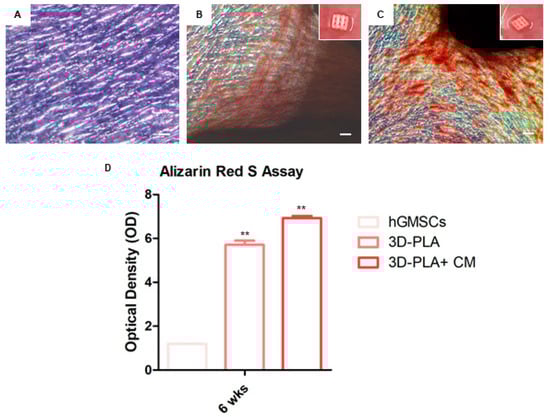 hGMSCs were observed by inverted light microscopy to verify the alizarin red S staining (Figure 3). Microphotographs showed the red positive staining in 3D-PLA + CM + hGMSCs when compared with 3D-PLA + hGMSCs. Insets in Figure 3B,C are a representative macrophotographs of 3D-PLA placed in multiwell cell culture plates. Obtained results were evaluated using spectrometric analysis after six weeks of culture (Figure 3D).