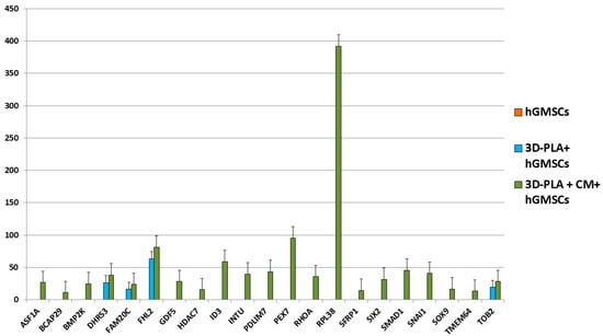 Expression levels of genes differentially expressed in hGMSCs, 3D-PLA + hGMSCs and 3D-PLA + conditioned medium (CM) + hGMSCs (false discovery rate (FDR) < 0.05; n = 3).