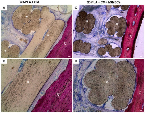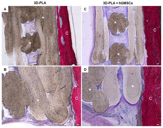 Histological examination of 3D-PLA + CM group and 3D-PLA + CM + hGMSCs group. Representative methylene blue and acid fuchsin images. (A) 3D-PLA + CM group at low magnification (4×); (B) 3D-PLA + CM group at high magnification (20×); (C) 3D-PLA + CM + hGMSCs group at low magnification (4×); (D) 3D-PLA + CM + hGMSCs group at high magnification (20×). *: 3D-PLA scaffold; C: rat calvaria. Scale bars represent 10 μm.