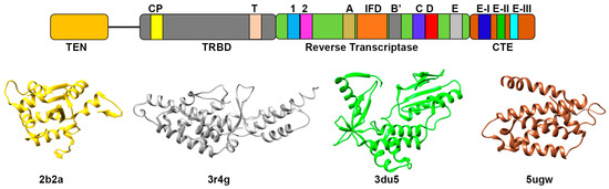 Schematic representation of TERT protein. Upper panel represents four domains of TERT protein as TEN, TRBD, Reverse Transcriptase and CTE domains. Motifs essential for activity of TERT protein domains are also shown in different colors. TEN and TRBD domains are joined by a linker. Lower panel shows TERT domains folding derived from crystal structures: Ten domain (PDB ID: 2b2a) and TRBD domain (PDB ID: 3r4g) from Tetrahymena thermophila, RT domain (PDB ID: 3du5) from Tribolium castaneum and CTE/thumb domain (PDB ID: 5ugw) from human.