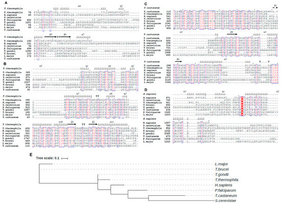 Sequence Alignment showing the conserved residues of TERT between T. thermophila, H. sapiens, S. cerevisiae, P. falciparum, T. gondii, T. brucei, L. major, T. castaneum for selected regions of (A) TEN domain (B) TRBD domain (C) RT domain and (D) CTE domain. The upper row in each alignment represents the secondary structure adopted by the domain in particular species where α-helix is represented as coil, β-sheet as arrows and β-turns as TT. Dots between the secondary structure elements or sequence alignment represent the deletion of residues/regions in species. Every 10th amino acid residue in the sequence is represented by a bold dot on the top. Red shaded regions represent the highly conserved residue across the species. (E) Phylogenetic tree between the TERT sequences of T. thermophila, H. sapiens, S. cerevisiae, T. brucei, T. gondii, P. falciparum, T. castaneum, L. major. T. brucei being ancestral eukaryote believed to have primitive TERT sequence from which TERT of L. major and other species evolved. Each species in the phylogenetic tree is connected to its branch through dashed line.
