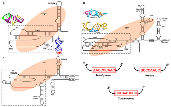 TER renders active site function providing RNA template which is required by the TERT for the de novo synthesis of DNA onto the chromosomal termini. In contrast to TERT, TER is the most versatile component of telomerase. It shows sequence and size divergence in wide range of eukaryotic species. Ciliates have the smallest reported TER, which is about ~150–200 nt long [46]. Vertebrate TERs range from ~310–560 nt [47] while yeast have the TERs ranging between ~780–1820 nt [48]. Although, sequence and secondary structure models of TERs from ciliates and higher eukaryotes were known for a while, it was not until recently TER components of deep branching parasitic microbes, which cause devastating impact on world health and economy, were described by our group and others [49,50,51]. The early branching eukaryotes like Trypanosoma have the TER of size ~1000 nt [49,50]. The largest TER of ~2.2 kb was reported from malarial parasite Plasmodium falciparum [51]. However, despite such size and sequence diversity, TERs from different species show broad evolutionary conservation in the mechanism of telomerase function. Figure 3A–C provides general reference to various TER domains described below.