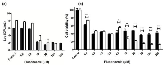 Viability of C. albicans in (a) planktonic culture and (b) adherent culture after treatment with fluconazole. The filled and unfilled columns represent treatments for 24 h and 48 h, respectively. * p < 0.05, ** p < 0.01, *** p < 0.001.