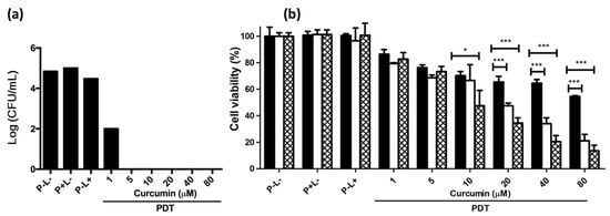 Viability of C. albicans in (a) planktonic culture and (b) adherent culture after PDT treatment. The total illumination time was 30 min. In the experiment of adherent C. albicans, illumination was carried out in one (filled), three (unfilled), or six (mesh) cycles. P and L represent photosensitizer and light, respectively. The symbol + indicates that the specific factor was used, and—indicates that the specific factor was not used. * p < 0.05, *** p < 0.001.