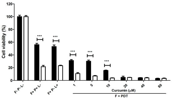 Viability of C. albicans in adherent culture after sequential treatment with fluconazole for 24 h (filled) or 48 h (open) and PDT utilizing curcumin. F, P, and L represent fluconazole, photosensitizer, and light, respectively. The symbol + indicates that the specific factor was used, and—indicates that the specific factor was not used. *** p < 0.001.
