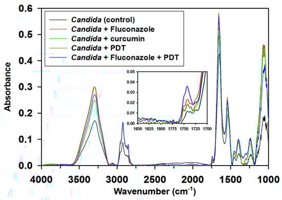 Fourier transform infrared (FT-IR) spectra of C. albicans before the treatment and after the treatments with fluconazole, curcumin, PDT, and combination of fluconazole therapy and PDT.