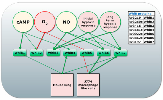 WhiB1-7 transcriptional response to environmental stresses. Proteins from the WhiB family are presented in the squares. The circles in the top indicate environmental cues (O2, NO, cAMP availability) or infection stages (initial or long term hypoxic response). Squares represent different environments (mouse lung and JJ774 macrophage like cells). Arrows indicated regulation (green for induction, red for inhibition of transcription) with the line width indicating the strength of the interaction based on the fold change of their transcript level in a given conditions [68,118].