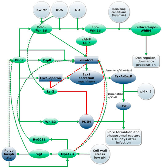 ESX-1 and secreted factors EsxA and EsxB are regulated by the two-component systems PhoPR, previously mentioned. The importance of PhoP for virulence was confirmed in knockout studies that showed phoP knockout mutants to be attenuated in mouse bone marrow derived macrophages, lungs, livers and spleen [156]. A single point mutation in phoP in Mtb H37Ra decreases the DNA affinity of PhoP and strongly contributes to the reduced virulence of this strain [157]. PhoPR regulated genes are upregulated in acidic and oxidative conditions encountered during the first two days of infection [40]. Recent studies show that PhoP interacts with SigE, which is upregulated in acidic pH and upon cell stress during the first three days of infection [40,158]. Additionally, polyphosphate was needed for normal transcription of phoP as well as for transcriptional regulation of sigE by MprAB, although these results could not be reproduced [159,160]. PhoP/R influences transcription of some 80 (according to some sources up to 150 [161]) genes directly as well as the transcription of a large number of genes indirectly via upregulation of WhiB6, EspR, DevS/R and WhiB3 [60,129].