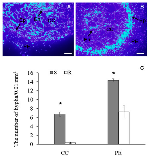 2.1. Histological Observation of Fusarium Spreading in Root Tissues of Banana Cultivars