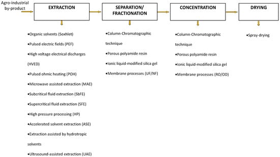 The development of adequate methods for the recovery of phenolic compounds from their original sources is crucial and can be accomplished through several steps (Figure 2). The processes employed should be environmentally sustainable and efficient, resulting in high yields.