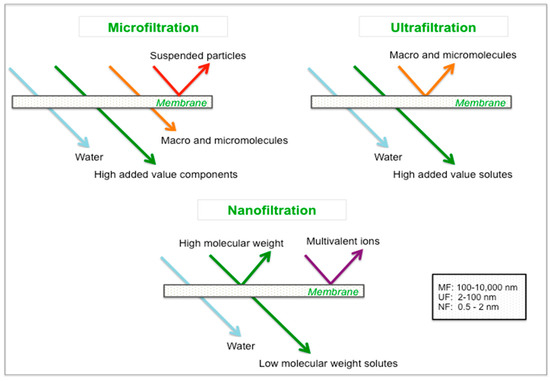 A schematic representation of MF, UF and NF processes is illustrated in Figure 3. Typical operating pressures related to these processes are specified in Table 1.